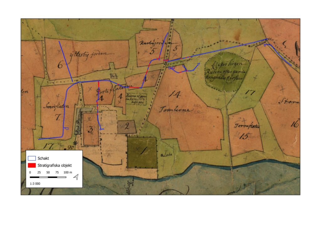 Figur 8. Karta från 1750 ägobeskrivning (beskuren) med schakt och stratigrafiska objekt. En av de tidigaste kartorna som tydligt visar området kring Kongahälla med kyrkoruinen markerad mitt i bild. Vid denna tid består området av åkermark, som bär namn som sannolikt anknyter till stadstiden, bland annat Tomterna, Torneflaten och Porteflaten (Lantmäteriet 14-ytt-58, 2025).